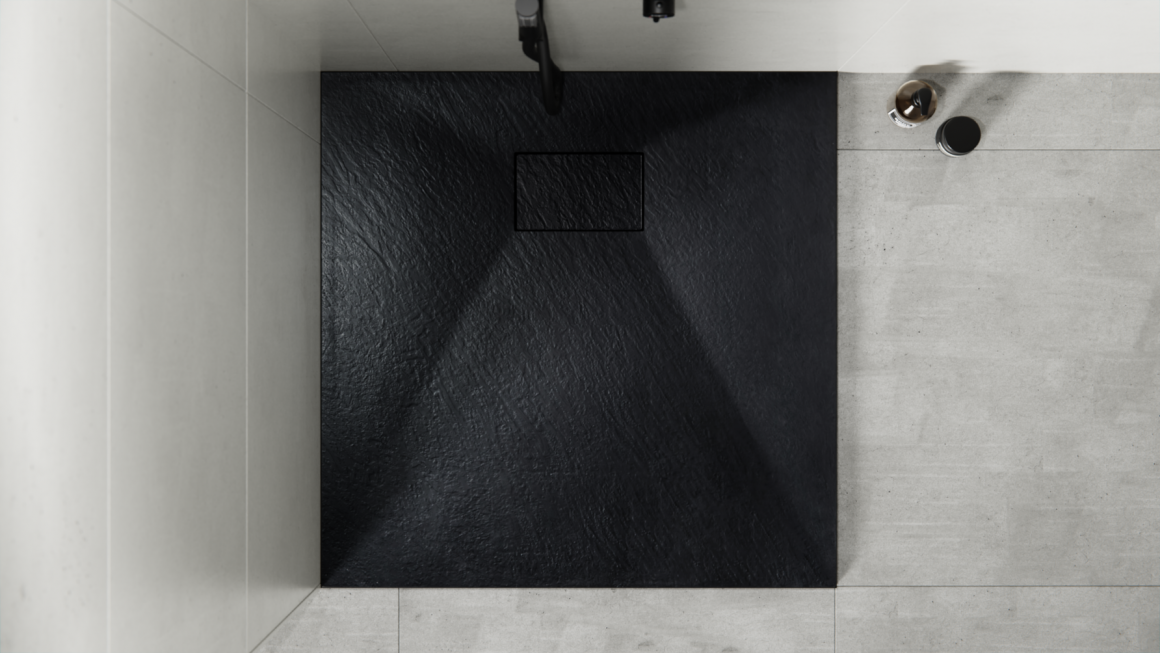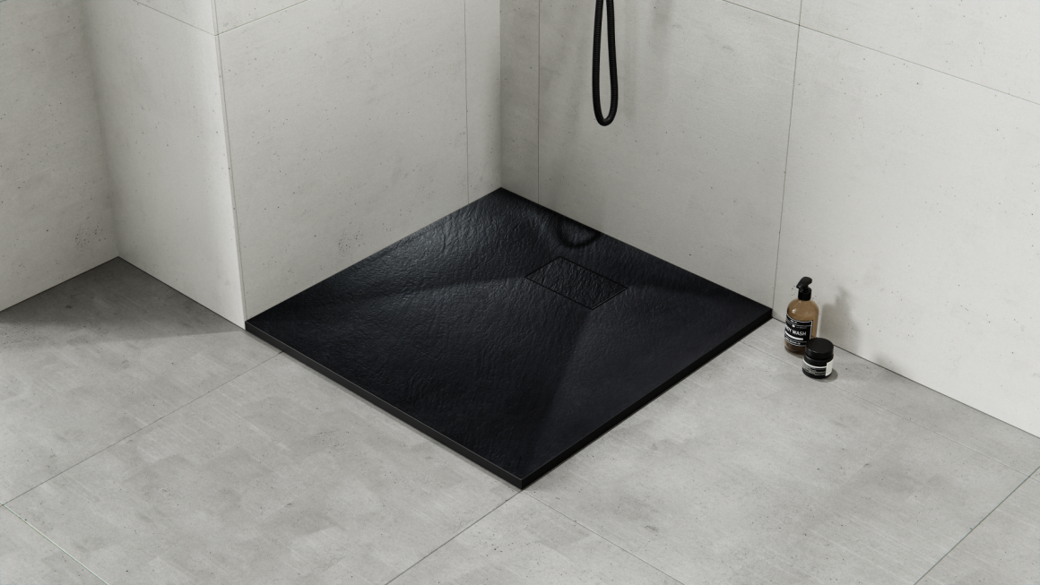 UltraSlim dušialus, SMC, matt must viimistlus, mille pinnal on õrn struktuur, mis imiteerib looduslikku kivi. Dušialuse hinna sees on sobiva äravoolukaane ja ülapuhastusfunktsiooniga sifooni komplekt. Dušialuse vorm võimaldab kas põrandale või põrandatasandile paigaldamist, mis võimaldab lävepakuta sisenemist duširuumi. Dušialust saab lõigata mõõtude järgi.
