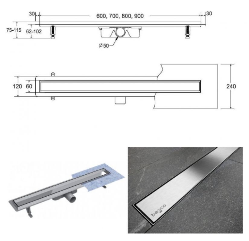 Lineaarne dušikraanikomplekt on komplektne ja monteerimisvalmis, see sisaldab: äravoolutoru koos sifoni ja paigaldusjalgadega, rest ja tihendusmansett. Õhuke võre, 6 cm lai. Madal paigalduskõrgus - algab 62 mm äärest. 2-in-1 duo tüüpi võre, harjatud kroomitud viimistlusega või paigaldamiseks keraamiliste plaatidega. Ø 50 mm ühendus (ilma vähendamiseta 40 mm). Materjal: roostevaba teras, ABS.