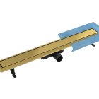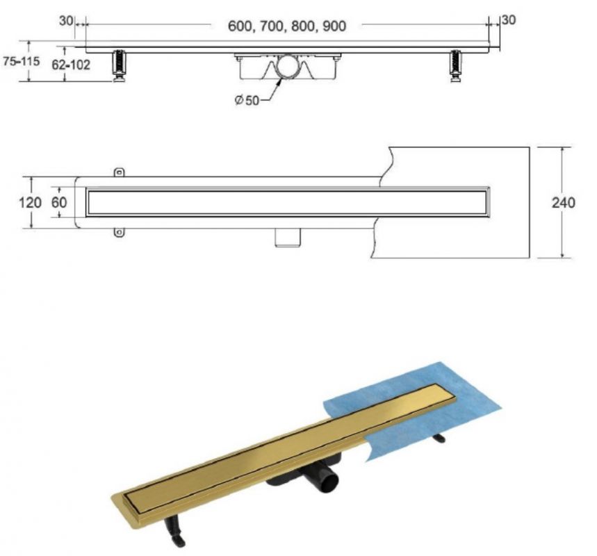 Lineaarne dušikraanikomplekt on komplektne ja monteerimisvalmis, see sisaldab: äravoolutoru koos sifoni ja paigaldusjalgadega, rest ja tihendusmansett. Õhuke võre, 6 cm lai. Madal paigalduskõrgus - algab 62 mm äärest. 2-in-1 duo tüüpi võre, harjatud kuldne viimistlus või paigaldamiseks keraamiliste plaatidega. Sifoon mustas värvitoonis ülemise puhastusfunktsiooniga ja kuni 56 l/min veemahuga. Ø 50 mm ühendus (ilma vähendamiseta 40 mm). Materjal: roostevaba teras, ABS.