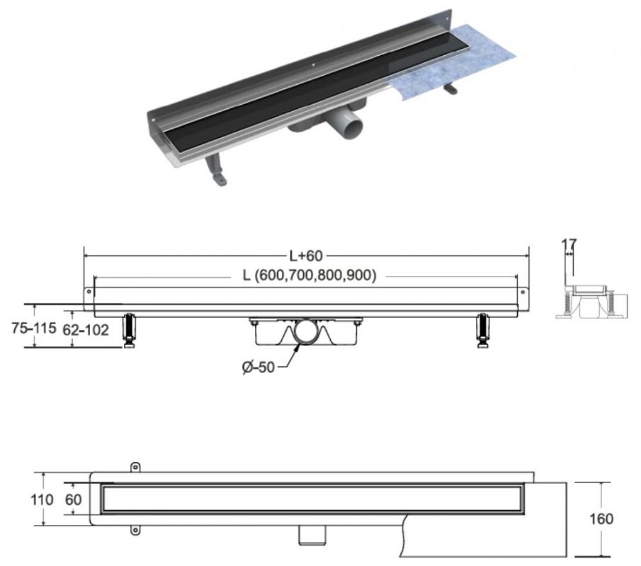 Lineaarne dušikraanikomplekt on komplektne ja monteerimisvalmis, see sisaldab: äravoolutoru koos sifoni ja paigaldusjalgadega, rest ja tihendusmansett. 6 cm laiune, klaasist valmistatud õhuke võre. Madal paigalduskõrgus - algab 62 mm äärest. Sifoon ülemise puhastusfunktsiooniga ja kuni 56 l/min veemahuga. Ø 50 mm ühendus (ilma vähendamiseta 40 mm). Drenaaž on ette nähtud seinale paigaldamiseks. Materjal: roostevaba teras, klaas, ABS.