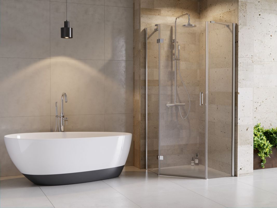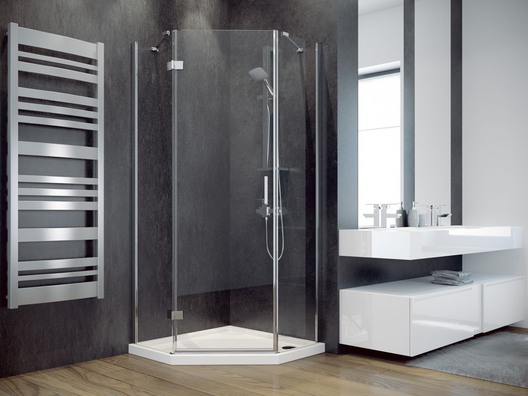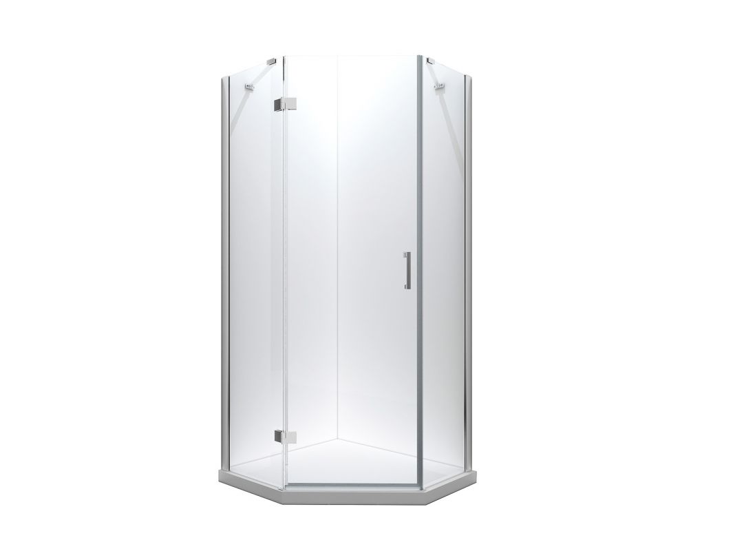 Viisnurkne dušikabiin. Kabiini parem või vasakpoolne külg. Turvaline karastatud läbipaistev klaas 8 mm, profiilita hingedega uks, metalldetailide läikiv kroomitud viimistlus. Magnetiline tihend ukses. Alumine ukse tõstmine hingedega. Lamell, mis juhib vee tagasi kabiini. Sobivad dušialused: Bergo SlimLine Saadaval on lai valik sobivaid kraanide ja dušikomplektide seeriaid.